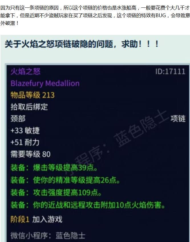PVE需要暗步打伏击也会因为破潜打不出来,直接就是几千金买了个负提升,但是橙项链的特效没有此问题,现在这个BUG只在火焰之怒这个项链上有,大家如果是盗贼玩家谨慎购入这个项链哦~