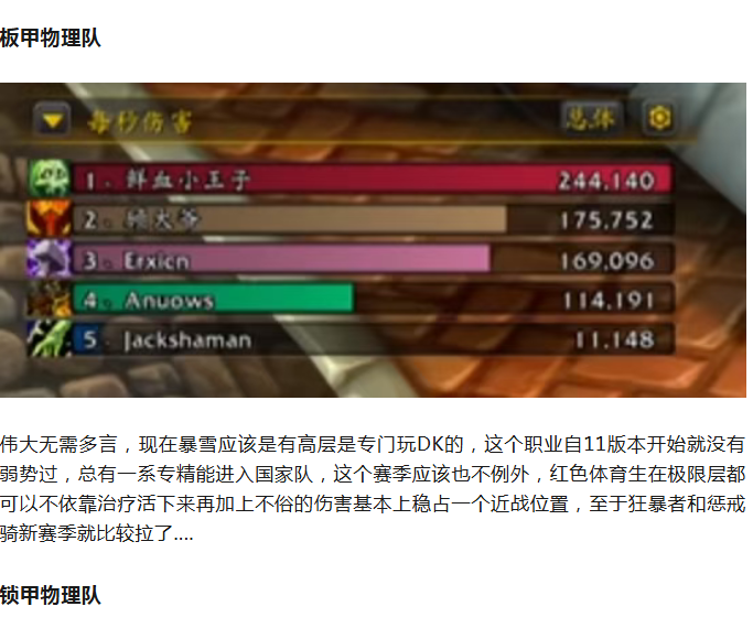 目前根据各主播的测评结果和测试服玩家的综合测评来看,恶魔术、邪DK稳进国家队了,坦克还是酒仙最稳定,治疗就是奶德了,第五个位置要么是12.0版本强势的增辉要么是自带法系BUFF的噬灭或法师。