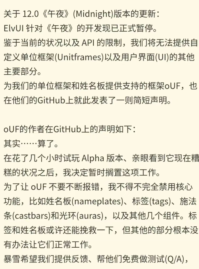 继WA宣布停更之后,UI界面也正式停更了,对于这个信息很多玩家表示不能接受,因为WA停更之后会有暴雪内置的wa代替,实在不行可以不用,但是ui界面如果停更,那么到时候画风可能就会倒退几年,一直看习惯的界面突然就没了,感觉都不是同一个游戏了。关于这个问题,不到一天的时间就冲上了论坛热帖榜。