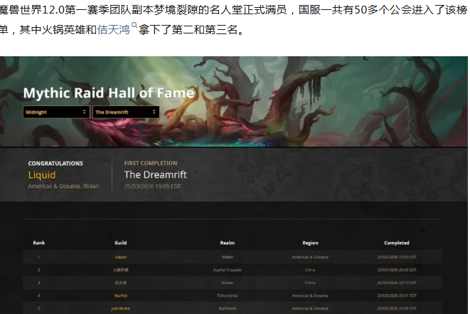 魔兽世界:M梦境裂隙名人堂满员,国服有52个公会上榜