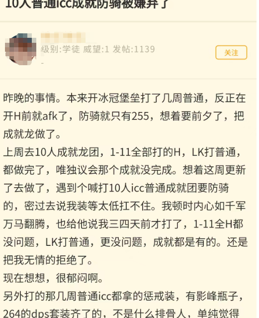 到现在打一个10人ICC还被嫌弃的职业,号主一气之下直接afk了。其实和职业没有特别大的关系,因为现在是版本末期,无论是装等还是细节,一些玩家都已经拉满了,所以哪怕是打10人ICC要求也变得更高了,一般的配置可能真的进不去,因为有着更高配置的玩家申请。