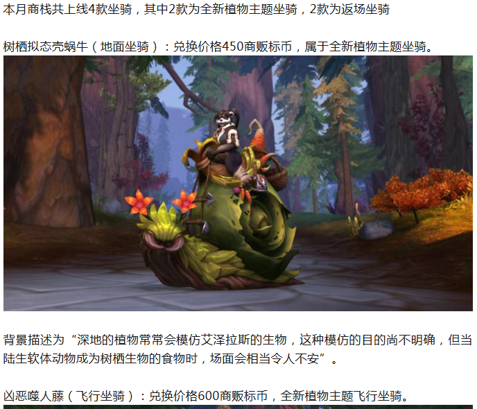 魔兽:4月商栈来了!两个新植物坐骑非常有特色!还有黄金比基尼!