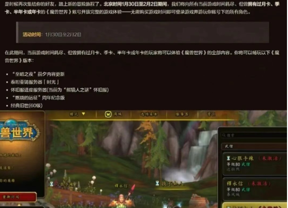 第二个重要的事就是暴雪推出了一个“老兵回归”活动,只要你之前充值过月卡、季卡、年卡的玩家都可以免费畅玩3天,从1月30号到2月2号,算得上是一个超级良心的活动了,这个活动所有的玩家都可以参与,但是有一点需要注意,那就是10区的玩家,需要比其他区多一步,需要先切换大区在回来,根据玩家的反馈这是一个BUG,如果还不行的话就要多刷新几次。