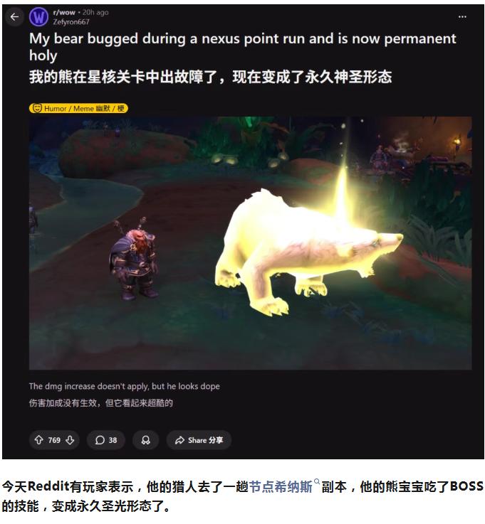 Reddit热议:猎人宠物在节点希纳斯获得变身永久圣光形态BUG!