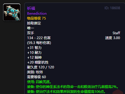 准确来说,应该是两把,毕竟祈福也可以转换成咒逐,用来当做DPS武器。相当于一次拿到两把法杖,对于牧师而言,就算花的金币多点,或许也是值得。