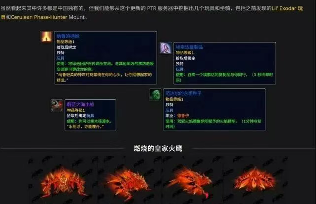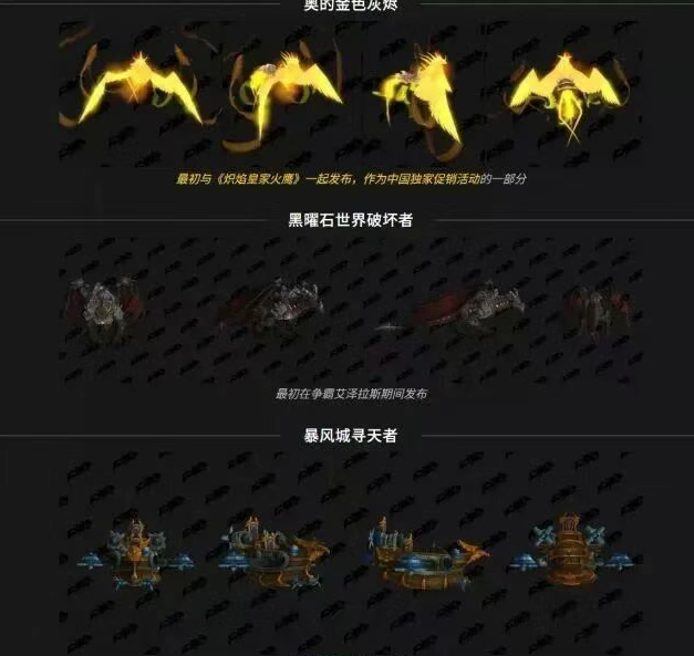 外网挖掘了关于mop版本的坐骑和玩具,其中包括了奥的金色灰烬,黑曜石世界破坏者以及暴风城寻天者。不过大部分坐骑现在都有了,只有死亡之翼还没,后续有可能会放出更多的坐骑和玩家,说不定会有一些更加珍贵的,还是值得期待一下。