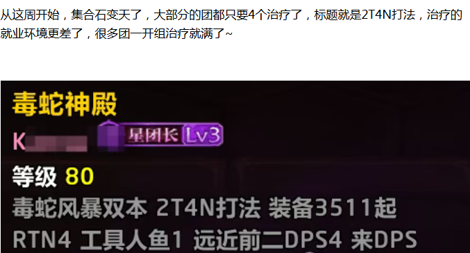 有治疗的玩家应该都已经发现了,这周的治疗非常难就业,除非是刚开组1个人的团,不然都是进不去组的,随便找个团都是治疗满,塞不下治疗