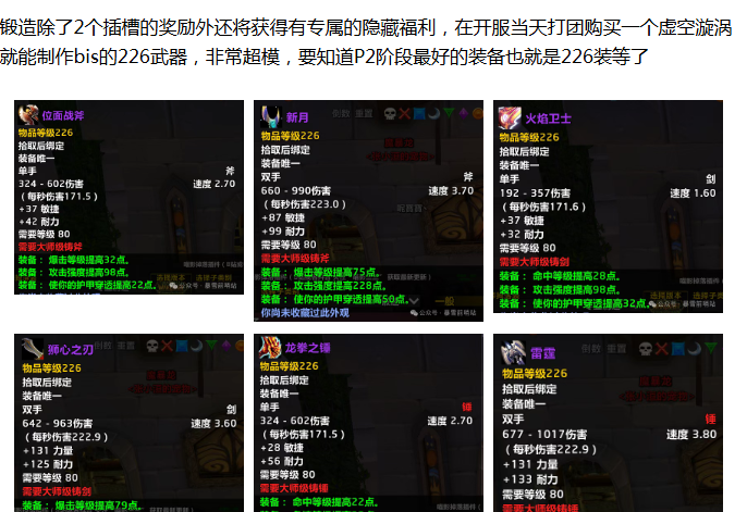 这些练了锻造的玩家在开服当天去团本里买一个虚空漩涡即可制作武器了,大家有需要这些锻造武器或者制造业装备的可以最近赶紧冲了哦~