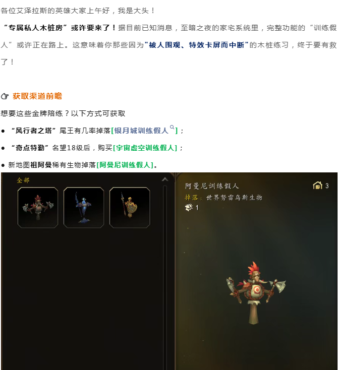 如果这个功能真能实装,那以后玩家打木桩练习DPS时可以回自己的家宅区域了。不说别的,一个人独享一个或者N个木桩,不香吗?