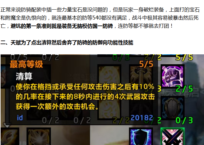 防骑最强的伤害天赋就是清算,所以很多冲榜的玩家会点出清算来,但是部分野团的防骑为了模仿冲榜团队强行点出清算,直接舍弃了防骑的防御向天赋正义审判和辩护,导致少了大量的常驻减伤。