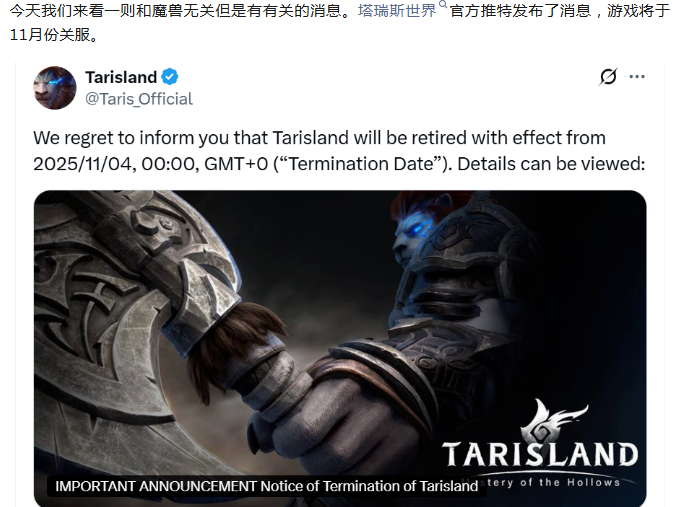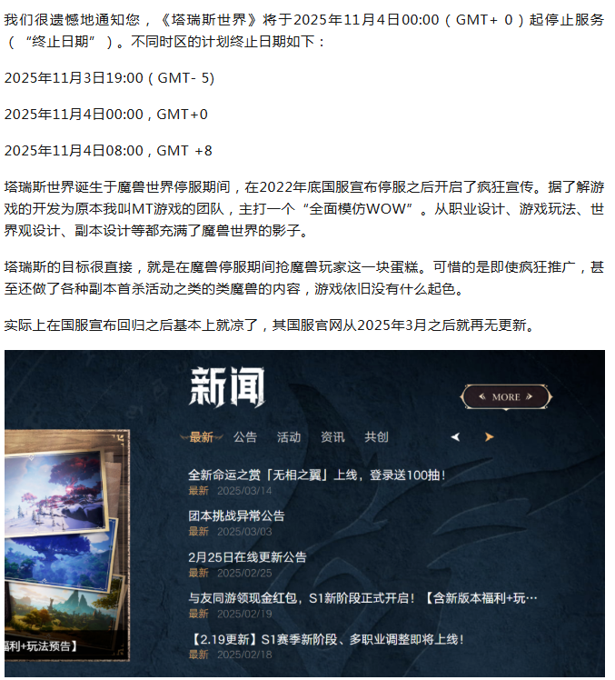 塔瑞斯世界正式宣布关服,又一个“山寨魔兽”死了
