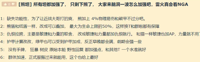 魔兽世界泰坦重铸时光服zst和dkt纷纷加强之后,玩家表示目前就剩下一个职业变成小丑了,那就是熊T。那么为了平衡4个坦克的实力,未来还是很有可能对熊t进行改动的,有玩家就脑洞了一波熊t的改法。