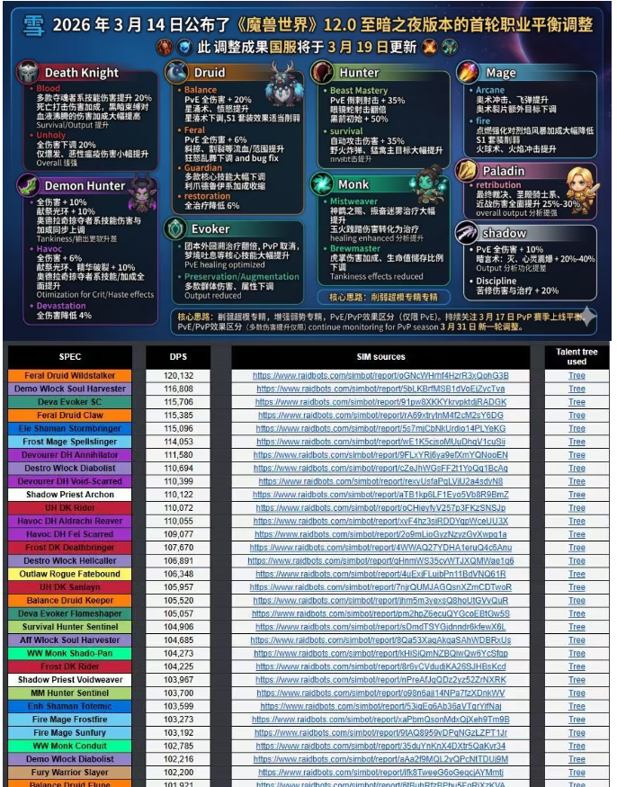 12.0至暗之夜终于是迎来了第一次职业大调整,暴雪在3月14号的时候发布了最新蓝贴,对各大职业进行了一个调整。不过就在一天之后也就3月15号全职业的模拟数据出炉了,结果没有一点意外,登顶是就是野德并且是断层的姿态领先,秒伤达到了12万。