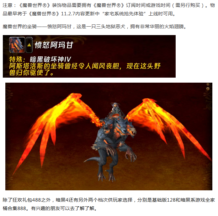 《暗黑破坏神4》国服今天正式上线了,目前价格公布一共三个档次,其中488的全资料片狂欢版本会附送一只魔兽世界的坐骑——愤怒的阿玛甘。