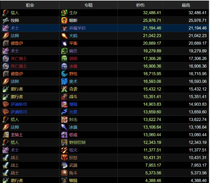 可能有朋友会说,敏锐贼在WLK版本根本不算是个正经DPS,这个天赋本来就很弱,只适合打PVP。 既然如此,那么我们就排除掉最后面的两个角斗战士和敏锐贼非主流职业之外,这时候垫底则变成武器战和狂暴战,其中武器战的最高伤害记录只有7953,也同样是只有生存猎的1/4还不到。