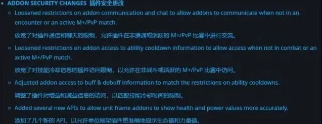 可以用了?暴雪最新蓝贴,重新更改对插件的限制。如果是不懂因为的玩家看到这个蓝贴,可能非常开心,因为上面清楚的写着wa在活跃的M+/PVP中可以使用,不过看了一眼英文原文,其实这个翻译有点小问题。否定句里面用or来连接并列关系,也就说在活跃的M+/PVP中也不能用,这一次只是做了一些细节的调整,依旧没有开M+/PVP的使用权限。