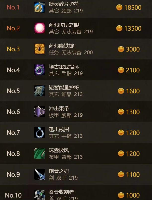 魔兽世界泰坦重铸时光服今日装备价格大涨,缚灵碎片护符已经到了近2玩金币,前段时间的统计才1万出头。橙斧的两个部位也有所涨价,萨弗拉斯之眼13500,萨弗隆铁锭3000。另外埃古雷亚指环超过了短暂能量护符,成为最贵的散件。