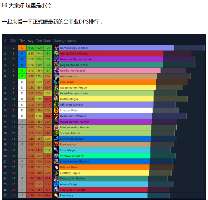 【魔兽世界】12.0 最新DPS排行!仅1个职业进入S级,伤害碾压第二名