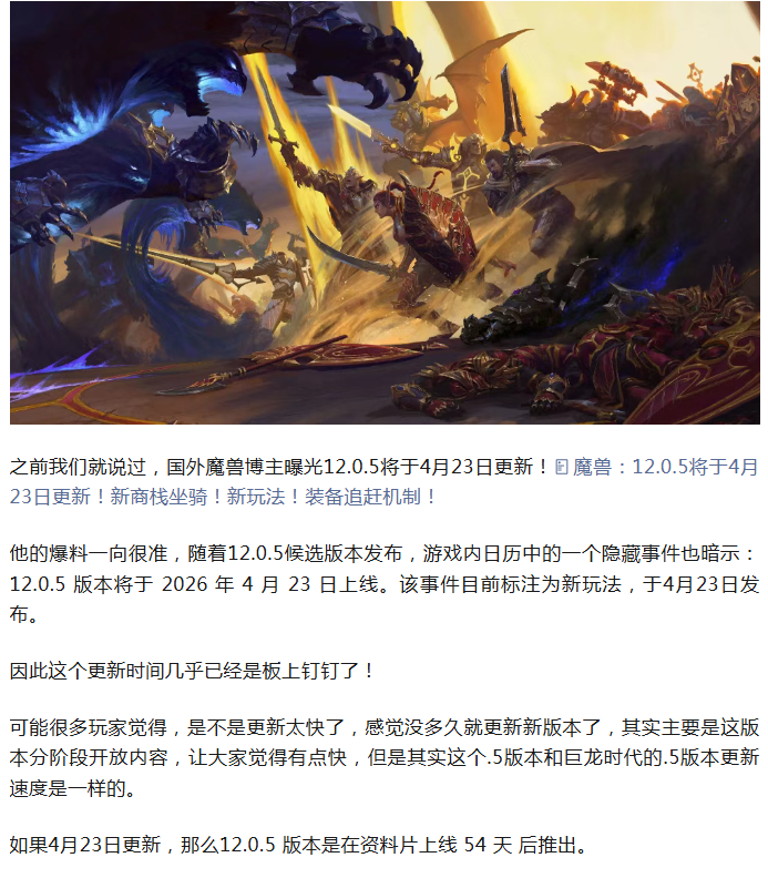 魔兽:游戏日历已暴露12.0.5上线时间!4月23日更新!