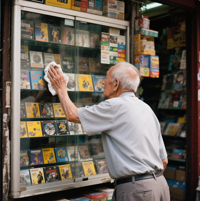 十二岁的周小川每天放学都会经过老城区那条飘着栀子香的小巷。某个雨天,他看到一个佝偻着背的老人在杂货店门口反复擦拭玻璃柜里泛黄的游戏光盘,柜角摆着歪歪扭扭的纸板,写着“代卖游戏账号,急用钱”。