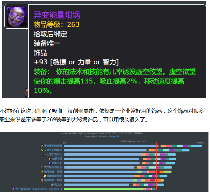 如图所示,对邪DK而言,除了同装等的艾林先知的凝视和圣光旗,其他的饰品都比不上同装等的坩埚,可以说是非常超模了,依然可以继续带。