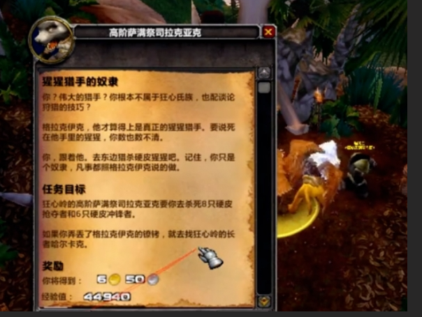 5、接到任务后我们来到狂心岭,找到高级祭司交任务,然后接到「猩猩猎手」任务和一个任务道具