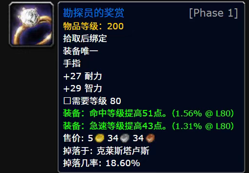 在岩石大厅掉落的一个叫做【勘探员的奖赏】的智力戒指,没有法强的加成,反而有51命中和43急速等级,是团本前邪DK的次BIS装备,比那些敏捷的物理系戒指还要强。