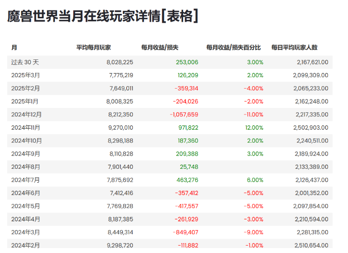 最近30天内的魔兽世界活跃玩家数量为802万人,相比上个月增加了25万人。