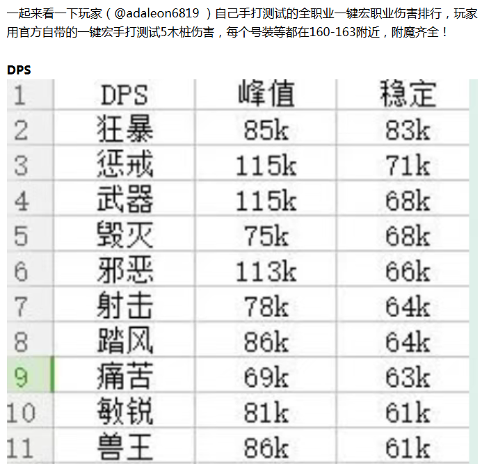 DPS方面,狂暴战、惩戒骑、武器战都很适合用一键宏来玩,伤害表现的还不错,恶魔术,元素萨,鹌鹑,火法,增辉这些职业就不是很适合一键宏了,不建议大家用一键宏来玩。