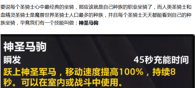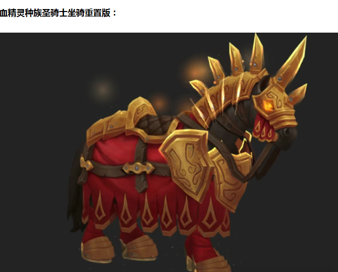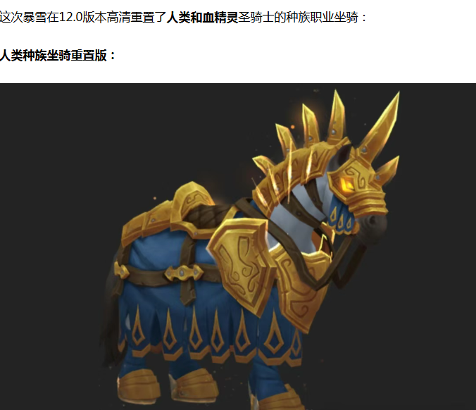 这两个坐骑的贴图都变成高清贴图了,而且更具部落和联盟的风格,联盟的蓝和部落的红都渲染的恰到其处,在12.0至暗之夜版本,圣骑士是绝对的主角,现在暴雪也趁此机会将圣骑士一些老旧的模型更新,而且之前数据挖掘在12.0极有可能会全种族圣骑士,大家拭目以待!