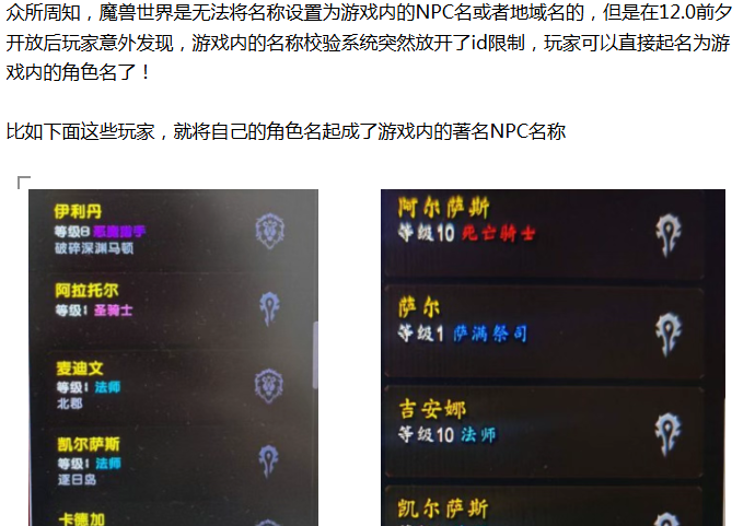 伊利丹、麦迪文、卡德加、吉安娜都成了玩家的姓名,现在还不清楚这是BUG导致的还是官方刻意为之,如果官方不回收那么这些ID将会卖出天价,毕竟对于cos党或者rp党来说,这些id都非常有代入感....
