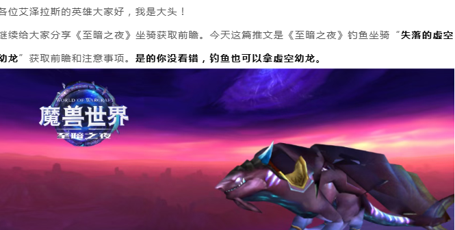 魔兽世界:至暗之夜钓鱼坐骑“失落的虚空幼龙”获取前瞻,是的你没看错,钓鱼也能拿虚空幼龙