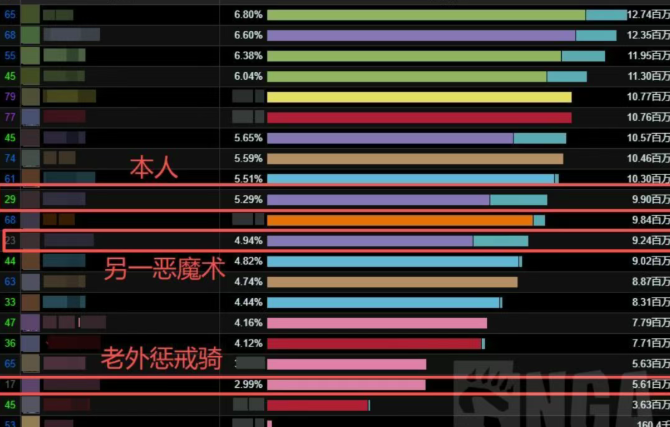 可以看到,该玩家的全BOSS战伤害并不低,在团队中游水平,但是因为恶魔术现在高手云集,就算你在团队里伤害很高,但是纵向和全服的恶魔术比可能就很低了,最后该玩家也是因为WCL评价里有5个灰分导致没有分到金!