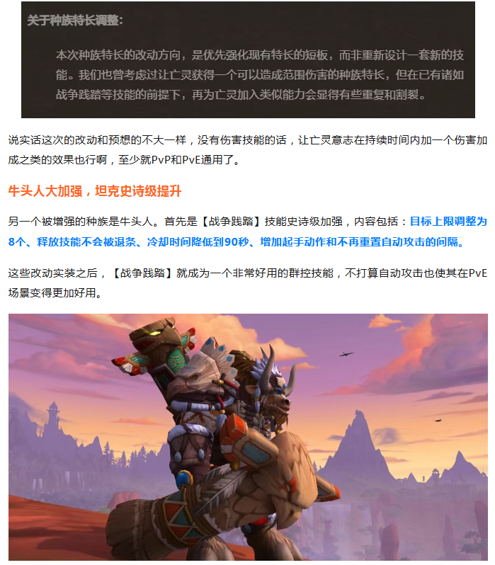 暴雪自己也在开发者注释中说道,原本考虑过让亡灵获得一个可以制造范围伤害的种族特长,但是因为牛头人已经有一个战争践踏了,所以感觉有点重复,最终没有加入。小O反倒觉得这才是更重要的改动,类似60级亡灵牧师有一个独有的噬灵瘟疫技能,DPS大提升。