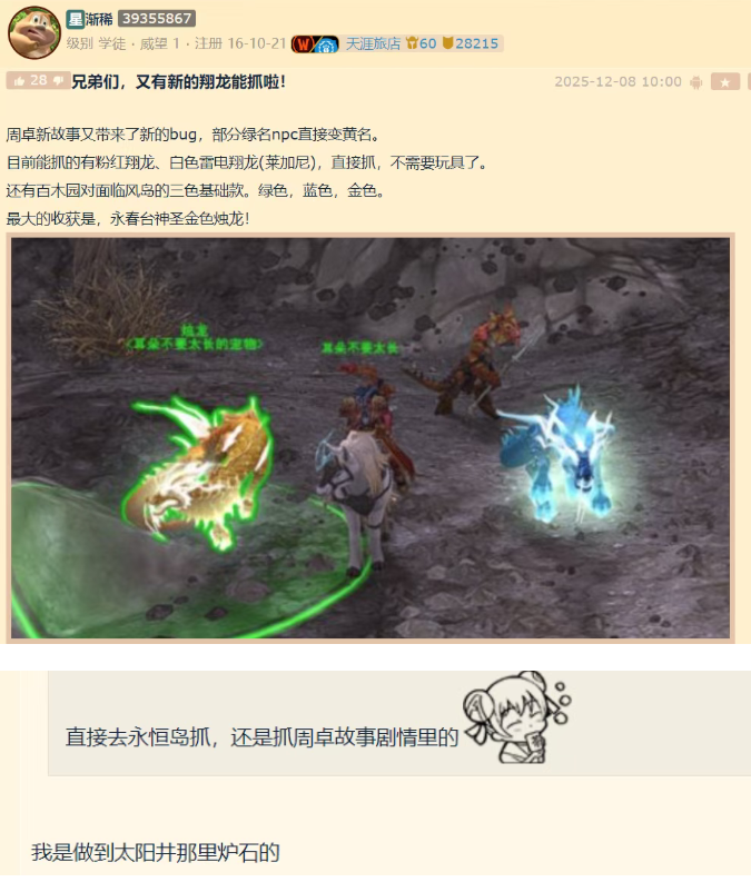 来自NGA网友的分享,魔兽世界最新的周卓故事带来了新BUG,导致玩家可以抓到各种颜色的翔龙,甚至还有金色的烛龙。具体做法见下图。