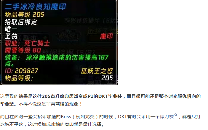 这次直升送的是205装备,其中最值得关注的就是DK的【二手冰冷良知魔印】,这个魔印的加成是“冰冷触摸造成的伤害提高187点。”这个属性比起原本第一阶段DKT毕业魔印【冰冷良知魔印】的加成还要高出76点。