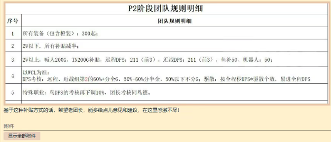 论坛上有一个熟练的老团长制定了P2的分金明细,其中2W以上一共有六类,分别是,喊人200G,TN200G,远程DPS:211(前3),近战DPS:211(前3),鱼补50、机器人:50。这是集合了众多论坛老团长的建议之后修改的版本,不知道大家觉得如何?