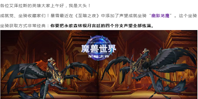 魔兽世界:《至暗之夜》新增声望成就龙鹰,黑色外观、悬停有羽毛特效