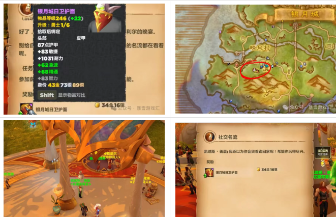 继失落的哈谢神像后又有一件BIS装备可以拿,那就是银月城日卫护面,这是一件246装等的头盔。获取方式如下:银月城宫廷名望达到9级之后直接去银月城晴风村下面,完成萨瑟利尔的聚会解锁附近蓝的任务完成保卫符文石,然后就可以去找军需官领取这一件246的bis头盔了。