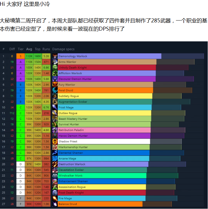 【魔兽世界】12.0 第二周全职业DPS排行!1个超模DPS已碾压所有人 原创 小冷 小冷 暴雪前哨站 2026年4月2日 18:10 贵州 听全文 在小说阅读器中沉浸阅读
