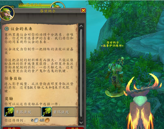 我们使用德鲁伊角色传送到月光林地,然后红圈位置找到德鲁伊训练师接到任务:议会的未来,这里还有另外一个任务奖励头盔,喜欢的小伙伴可以也做一下。