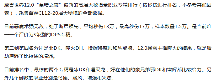 魔兽世界:最新全职业专精排名出炉!恶魔术断层领先