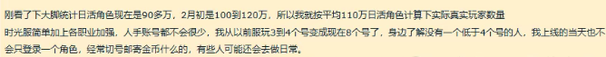 有玩家计算了时光服真实玩家的数量,之前一直都是按照满级的活跃职业专精进行统计,没有考虑到一人多个职业的情况,这一次把这个情况也考虑进去了,计算依据是第三方统计的数据:日活角色现在是90多万,2月初是100到120万,按平均110万日活角色计算下实际真实玩家数量。按照一个人4个角色来算,27.5万个玩家,按照以往的魔兽数据一般周活跃玩家=日活跃玩家×1.4,所以真实玩家数量=27.5×1.4=38.5万左右。当然这一个数据只是简单的统计和估算,并不代表实际的人数。