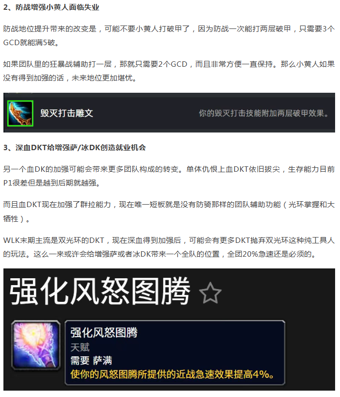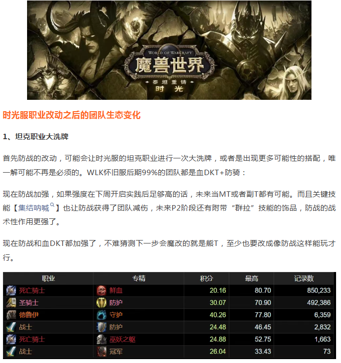 魔兽世界泰坦重铸时光服第一阶段团队副本刚刚开放,暴雪就放出了3个职业的重磅魔改,包括增强萨、防护战士和鲜血死亡骑士。这些改动,特别是后2个关于防战和血DK的改动,可能会给时光服的生态和未来带来很大的影响。