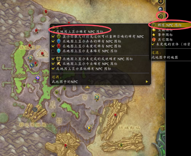 安装好插件之后,我们打开地图,按照下图的设置就能在地图上看到稀有的位置,插件会根据你击杀情况标记,缺少的去蹲点。