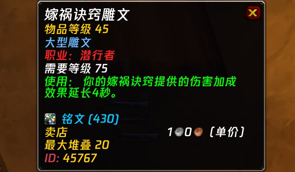 另外,嫁祸诀窍雕文现在已经改成最新属性了,盗贼朋友们记得改成这个雕文。使用嫁祸诀窍雕文之后,嫁祸技能提供的自身伤害加成会延长至10秒。