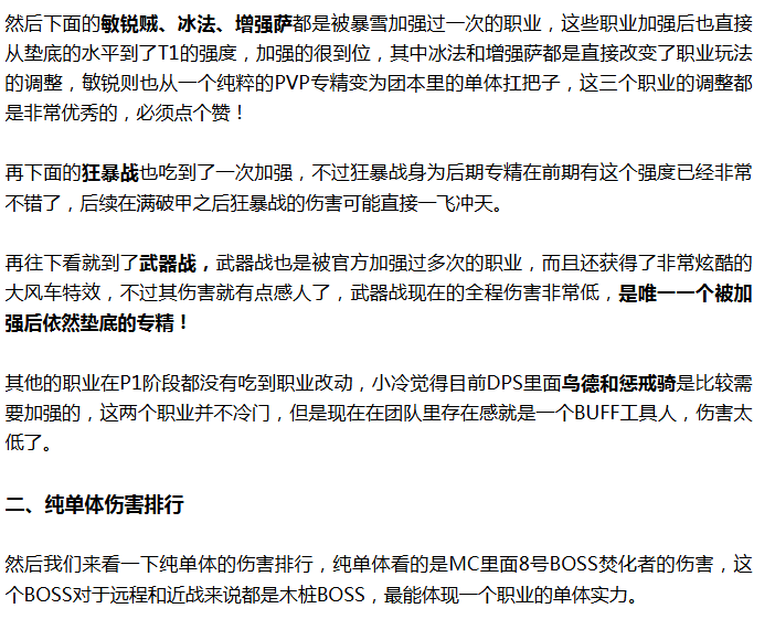排名前三的职业里除了老牌强势职业生存猎和痛苦术外还有一个被官方新增强的兽王猎,兽王猎在加强后直接一飞冲天,AOE单体两开花,直接超过了生存猎,在吃了官方的一次削弱后依然可以登顶MC,在MC里是表现的最好的DPS职业,综合素质很强,不论是单体还是AOE表现都非常出色。