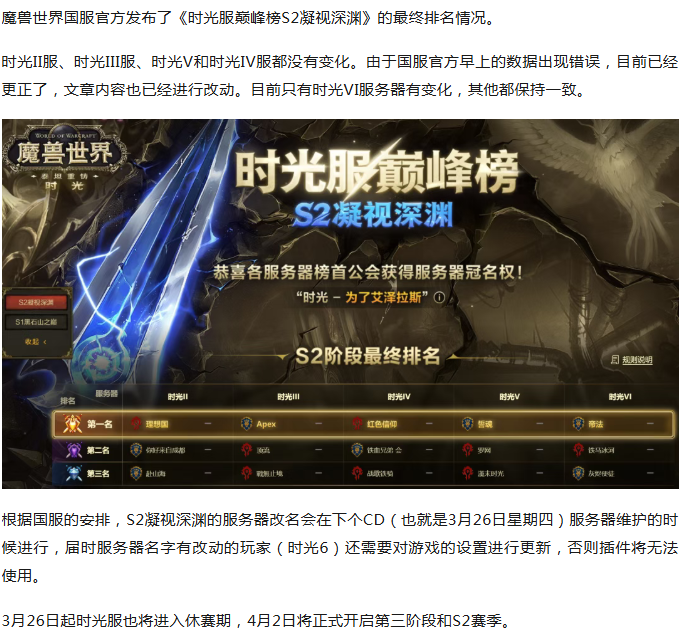 魔兽时光服:S2巅峰榜结果出炉!一个服务器玩家需要改设置