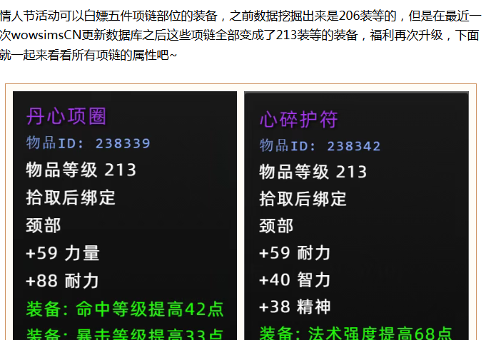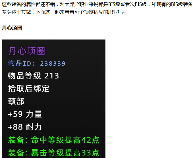 丹心项圈是无数玩家所期待的力量属性项链,对于DK来说这个项链就是BIS级的,同时大部分的力量职业也都能用这个项链,比如惩戒骑和武器战等职业,毕竟现在力量项链太稀有了,这个项链的性价比很高。