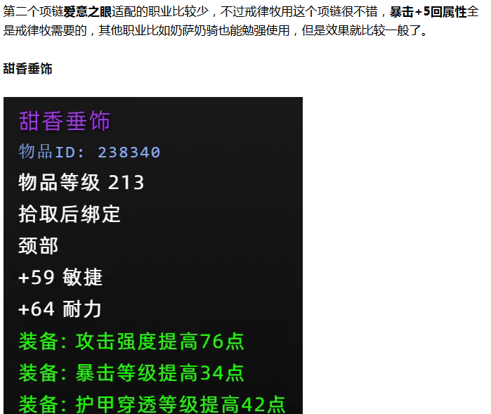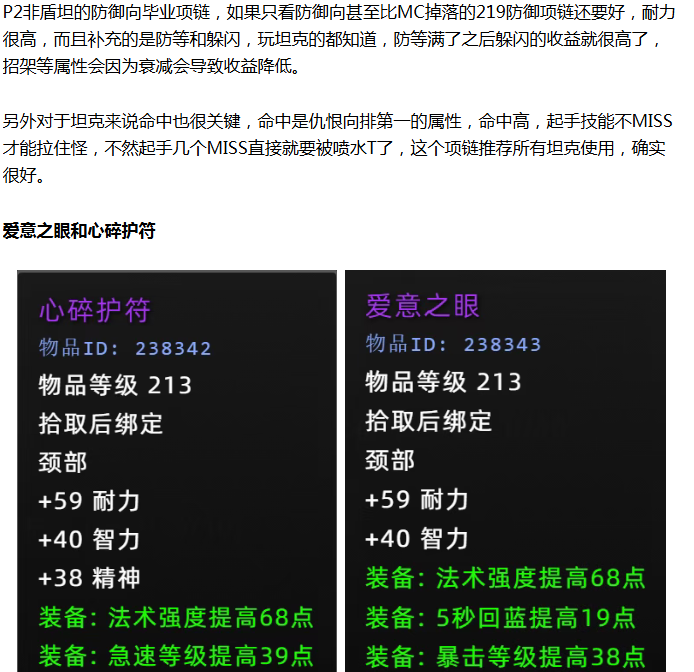 第一个项链心碎护符适合大多数的法系DPS来使用,精神现在对于AM、SS、FS都是有收益的,并且急速属性所有的法系都不嫌,是一个很好的过度项链,带到P3也是完全可以的,另外对奶德这种需求精神和急速的治疗来说,这个项链也非常不错。